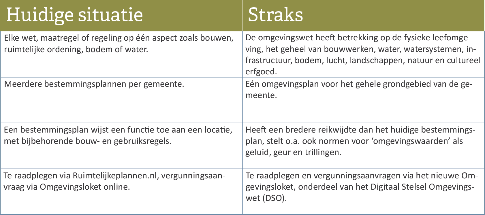 Belangrijke uitgangspunten van de Omgevingswet zijn minder regels, een duidelijk voorspelbaar omgevingsrecht, ruimte voor lokaal maatwerk en een snellere besluitvorming door een integrale werkwijze.