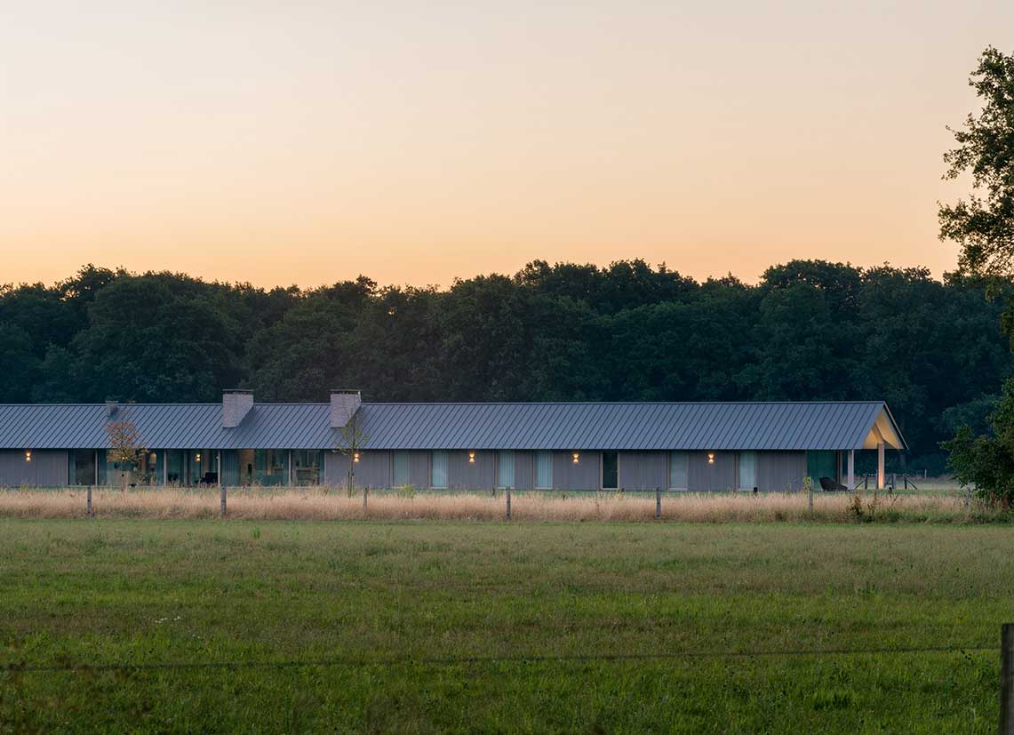 De gebouwen op het landgoed zijn geïnspireerd op de oude Twentse schuren, voorzien van veel glas en moderne gebinten. De woning en de bijgebouwen liggen op twee assen en hebben een sterke relatie met het landschap door zichtlijnen richting de omgeving. Schorn: “Vanuit iedere kamer van het huis heb je een uniek uitzicht.” Het gebruik van vergrijsd hout en het gepatineerd zinken dak zorgen ervoor dat het gebouw volledig opgaat in het omliggende landschap.